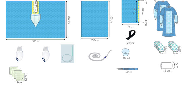 - Serweta dwuwarstwowa do artroskopii barku o wymiarach 220 cm x 320 cm, z workiem do zbiórki płynów – 1 szt.