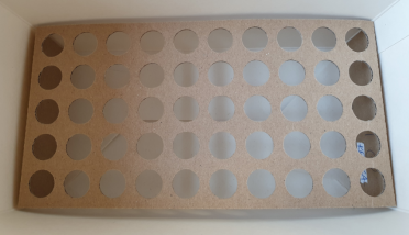 Kartonik z tekturowym statywem mieszczącym 50 szt. probówek lub probówko-strzykawek, o średnicy do ok. 15 mm.
